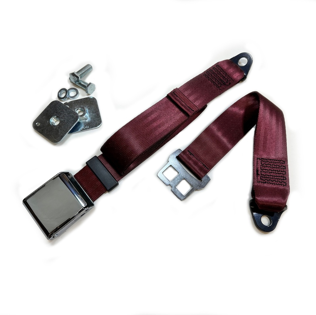 The seatbelt features a period style chrome plated lift-lever buckle and right-angled anchor brackets