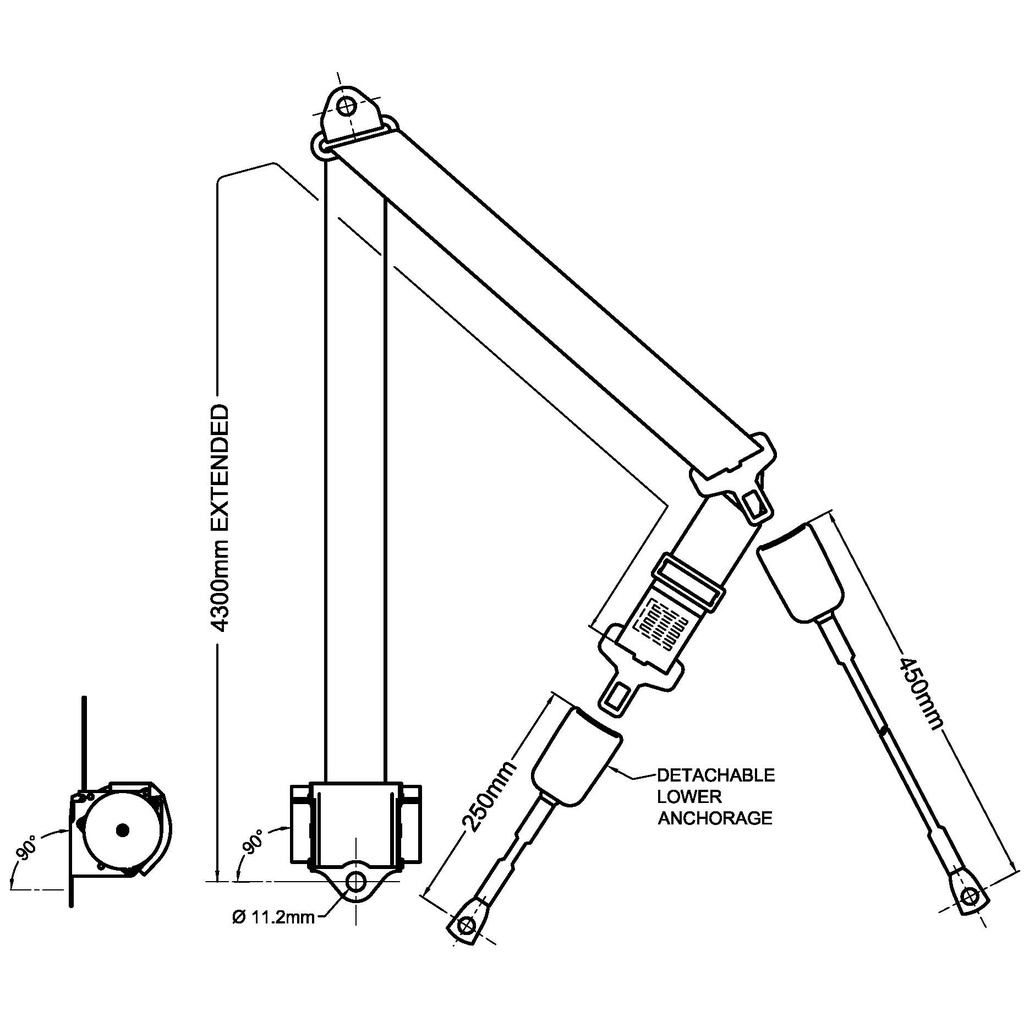 Seat Belt Long End (4.3 metres) with vertically mounted retractor and detachable lower anchorage point. Buckle Assembly (450mm). Buckle for Lower Anchor (250mm). Fitting Kit.