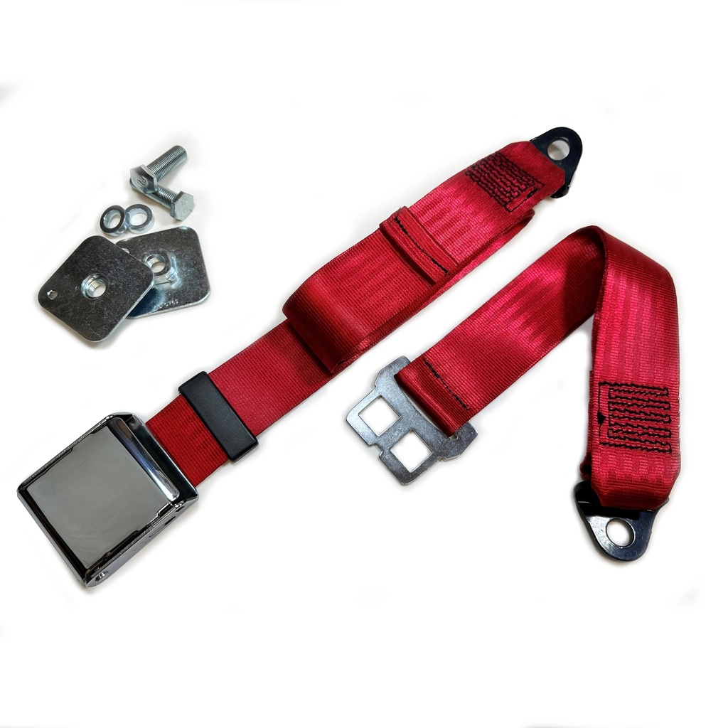 The seatbelt features a period style chrome plated lift-lever buckle and right-angled anchor brackets
